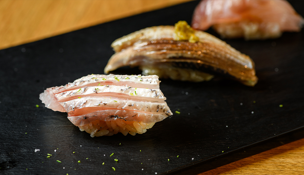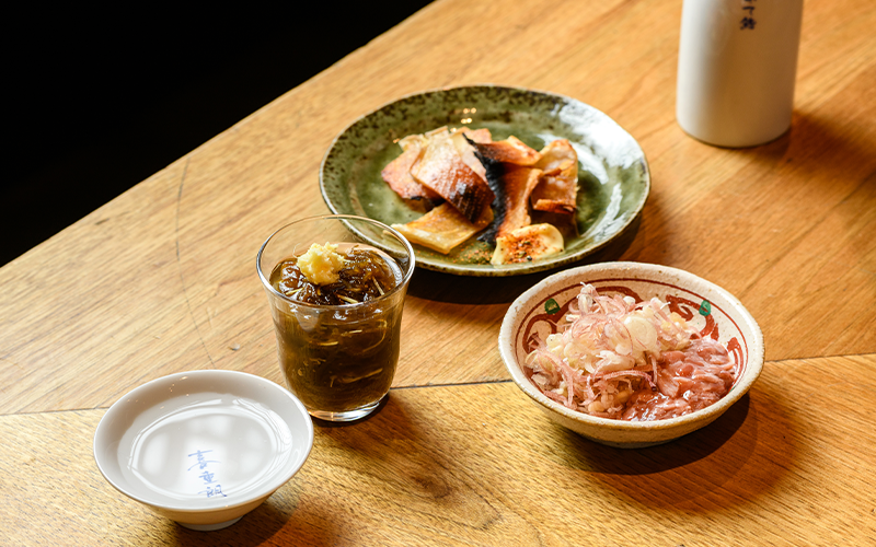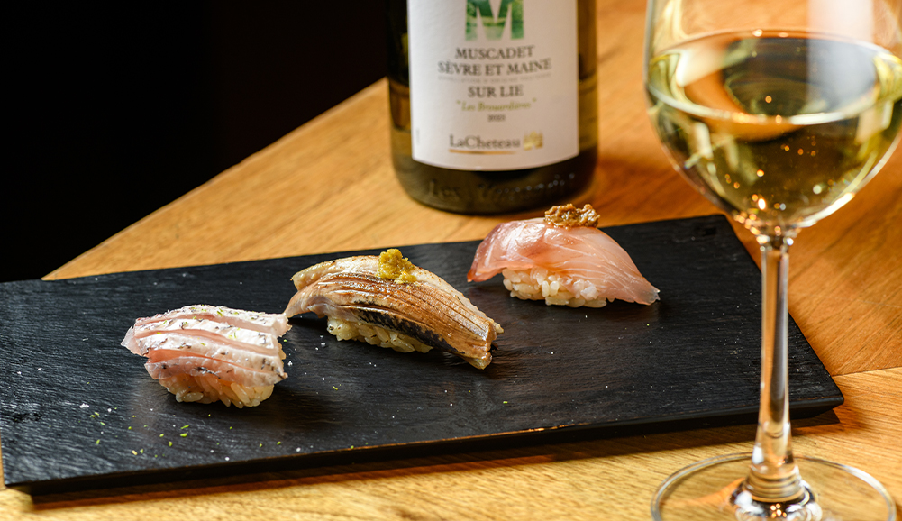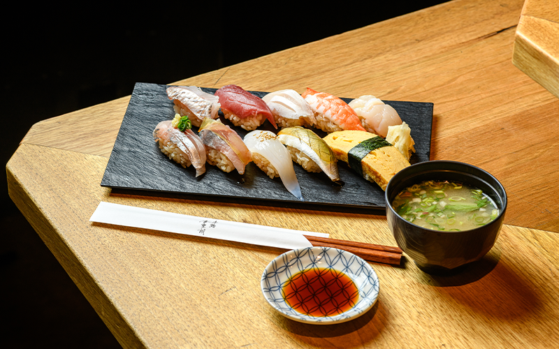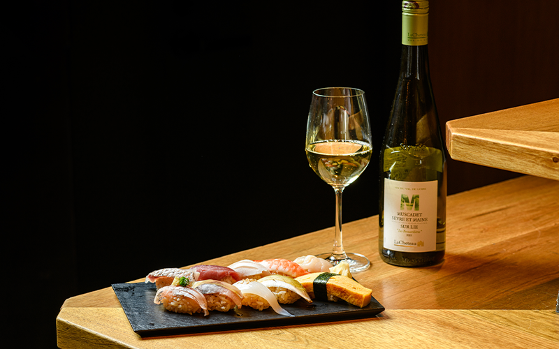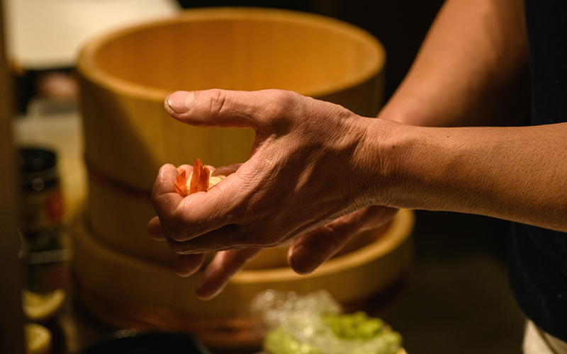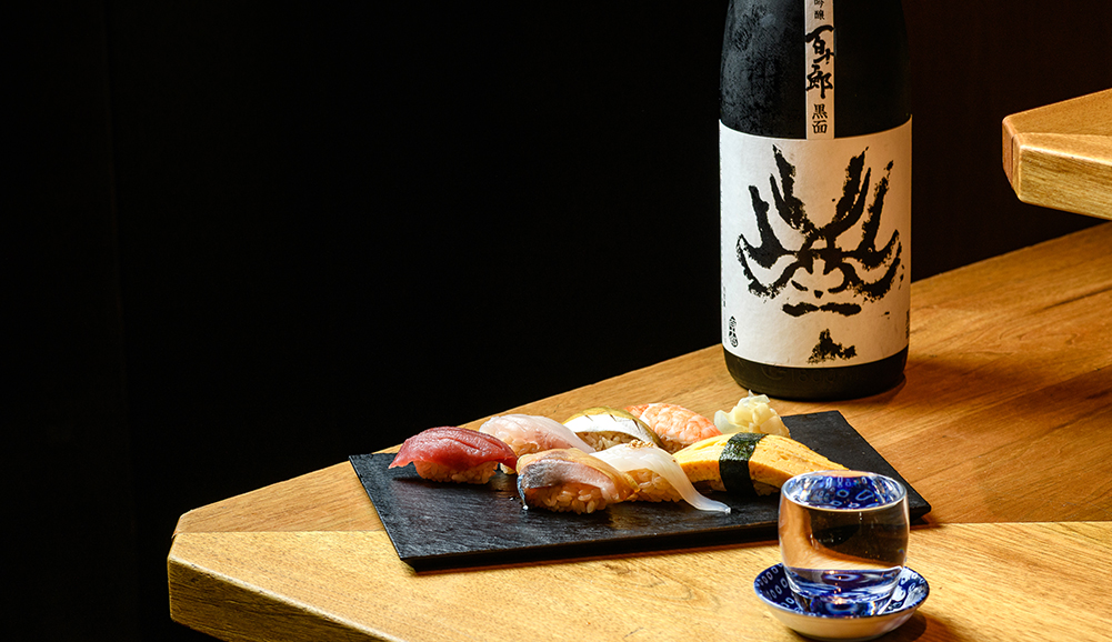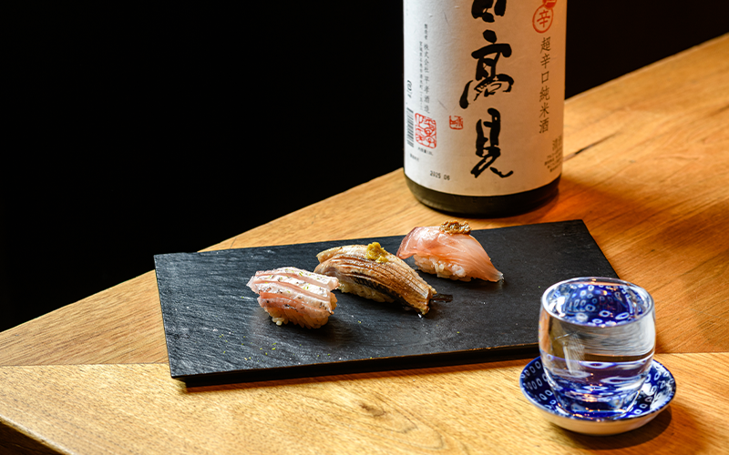 色々なキャラクターがある日本酒と、よく合う「あて」を「鮨」に一品一品仕上げています。